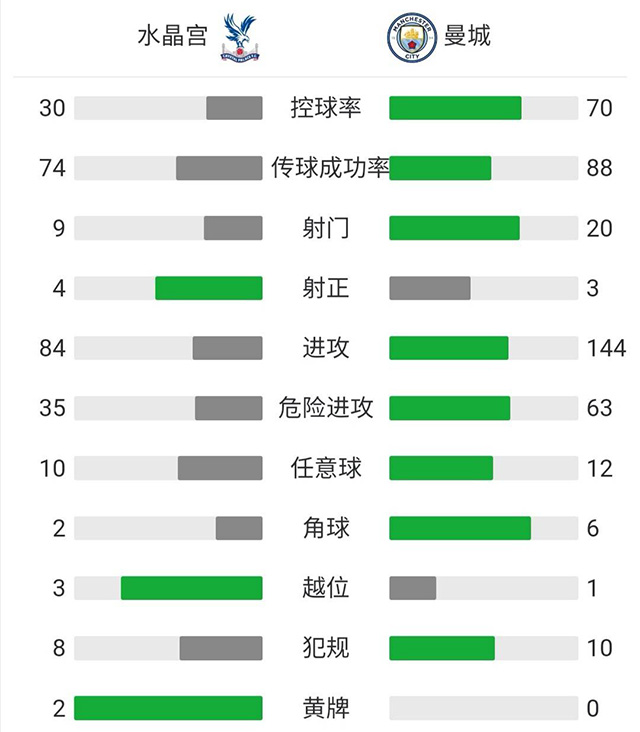 全场比赛结束,曼城客场2-0战胜水晶宫。