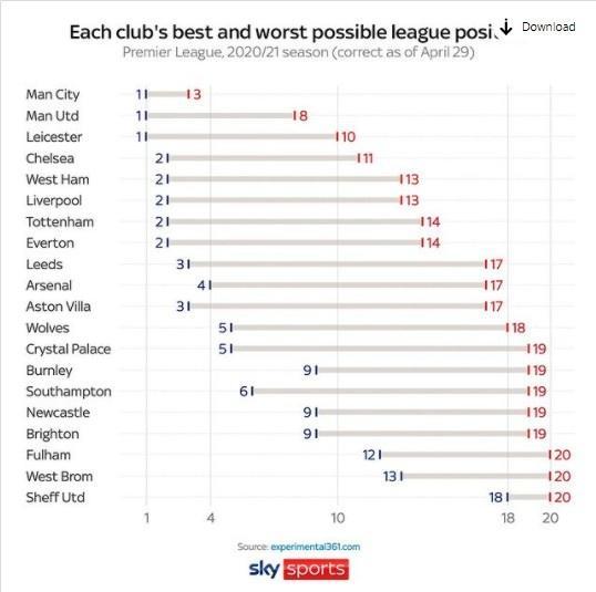 直播车讯 今天, 天空体育对本赛季至今英超积分榜进行了数据分析,曼城、曼联、莱斯特均有争冠可能,阿森纳仍然保有跻身前四的希望。