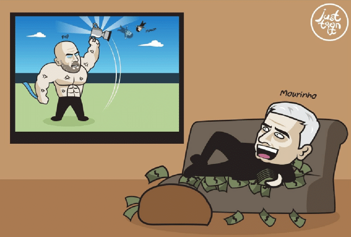 在刚刚结束的联赛杯决赛赛场上,热刺0比1不敌曼城,而且球队输得很惨,全场只有2次射门,如果不是洛里发挥出色,球队早被打成筛子了。而热刺输球,自然会和穆里尼奥联系在一起。英媒就发布了一个漫画,穆里尼奥笑看瓜迪奥拉捧杯的漫画。不过,这只是调侃,毕竟穆里尼奥虽然下课了,但是对热刺的感情还是有的,他肯定不会做出这样的事情。
