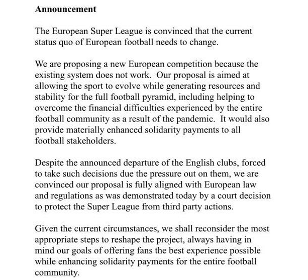 很快超级联赛就发布声明,他们表示:很失望英超球队在压力下退出,赛事暂停进行,我们将重新考虑以合适的方式重塑这个项目。