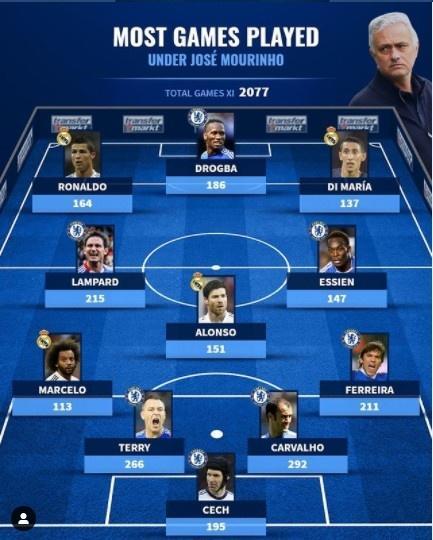 直播车讯 今日,德转统计出了在穆帅手下出场次数最多的球员阵容。