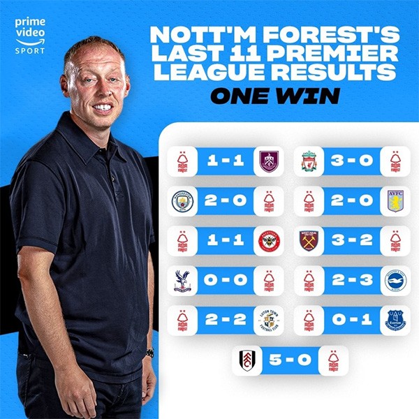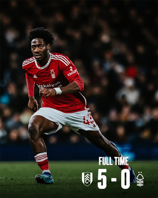 在7日凌晨结束的英超第15轮比赛中,诺丁汉森林在客场0-5完败给富勒姆。此役输球后,森林已经遭遇联赛4连败。近11场英超比赛中仅对阵维拉取得一场胜利,其余10场4平6负。目前,诺丁汉森林积13分,仅仅比被扣掉10个积分的埃弗顿多出6分,保级形势不容乐观。