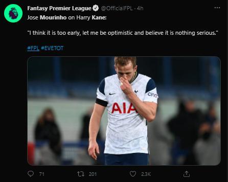 直播车讯北京时间4月17日,英超第32轮,热刺客场2-2战平埃弗顿,凯恩疑似受伤被换下场。赛后穆里尼奥谈到了凯恩的伤情,他表示应对此保持乐观。