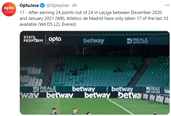 据统计,自从2月份以来,马竞11场联赛的战绩为4胜5平2负,33分只拿到17分。而在2020年12月至1月期间,马竞8轮联赛全胜,拿到全部的24分。