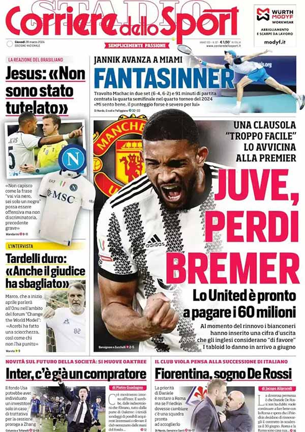 布雷默是性价比较高的中后卫,去年12月,巴西国脚与尤文签署了一份新的长期合同,但作为交易的一部分,双方同意了6000万欧元(约5000万英镑)的毁约金额,在曼联看来,这个价格非常「软」(soft),就是白菜价,低得令人讶异。
