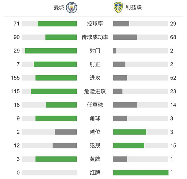 曼城1-2利兹联 蓝月多赛2场领先14分