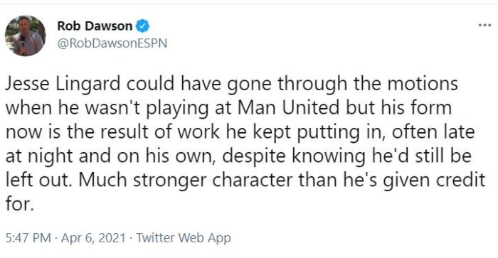 ESPN记者罗勃·道森(Rob Dawson)则披露,在曼联被弃用的时期里,林加德并没有自暴自弃,反而自己加练到深夜。「当林加德在曼联打不上球的时候,他本来可以敷衍了事。但他能有现在的状态,是他自己不断努力保持的结果,他经常在深夜自己加练,尽管他知道仍然会被排除在外。他比人们想象的要坚强得多。」