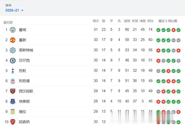 曼城以74分继续领跑积分榜,曼联则凭借一波三连胜,在第三到第五名球队丢分的情况下拿到宝贵3分,以60分排名第二。