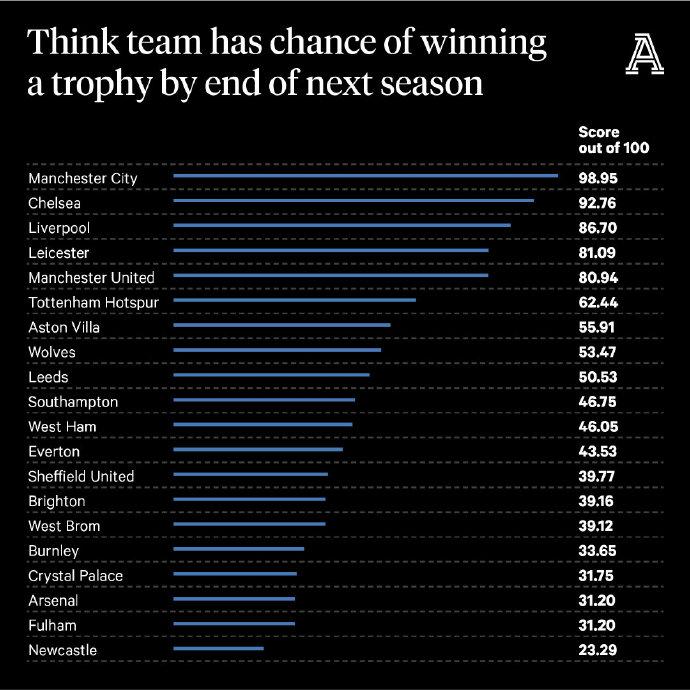 球迷对球队下赛季能否夺得冠军的信心排名,98.95%的曼城球迷认为球队下赛季可以拿到一个冠军,随后是切尔西,92.76%的球迷认为他们下赛季可以拿到一个冠军,随后是利物浦,86.70%的球迷认为他们下赛季可以拿到一个冠军。六强其他球队,曼联排名第五,80.94%的球迷认为球队下赛季可以拿到一个冠军,热刺排名第六,62.44%的球迷认为球队下赛季可以拿到一个冠军,阿森纳排名倒数第三,31.2%的球迷认为球队下赛季可以拿到一个冠军。