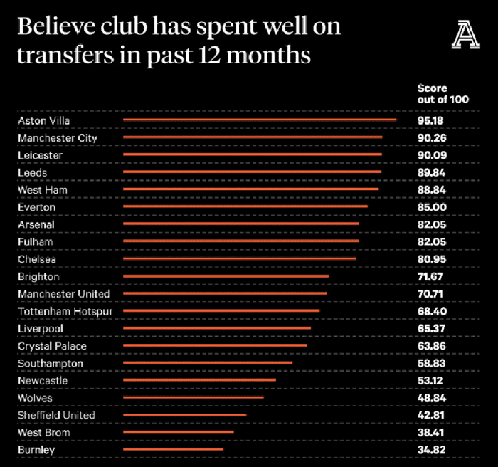 上图是英超各大球队球迷对球队本赛季转会情况满意度调查,其中95.18%的维拉球迷对球队的转会感到满意,随后是90.26%的曼城球迷对球队的转会感到满意,跟着是90.09%的莱斯特城球迷对球队的转会感到满意。而英超六强其他球队,阿森纳排名第七,球迷对球队转会满意度是82.05%,切尔西排名第九,球迷对球队转会满意度是80.95,曼联排名第十一,球迷对球队转会满意度是70.71,热刺排名第十二,球迷对球队转会满意度是68.4%,利物浦排名第十三,球迷对球队转会满意度是65.37%。