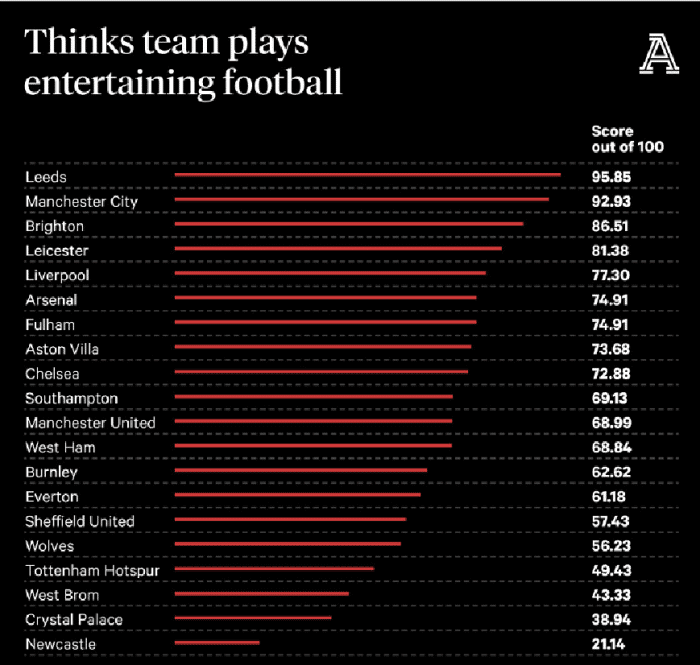 最后一个是英超各大球队对球队比赛精彩程度的满意度,其中利兹联球迷最满意,他们的满意度是95.85%,其次是曼城,92.93%的球迷满意球队的比赛过程,第三是布莱顿,86.51%的球迷满意球队的比赛过程。六强其他球队,利物浦排名第五,满意度是77.3%,阿森纳排名第六,满意度是74.91,切尔西排名第九,满意度是72.88%,曼联排名第十一,满意度是68.99%,热刺排名倒数第四,满意度是49.43%。