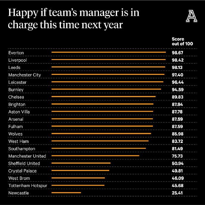 来源:直播车04-02 15:39直播车讯 本赛季即将过去了,而英超的最终排名也快要确定了,这种情况下权威媒体The Athletic也开始发起了一个问卷调查,他们对本赛季英超各球队球迷对球队的满意度、主帅的满意度、下赛季夺奖信心的满意度、俱乐部运营情况的满意度、过去一年转会操作的满意度和球队比赛精彩程度进行了调查,具体情况如下: