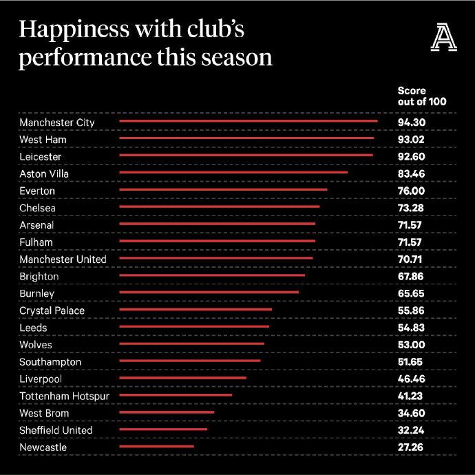 上图是各大球队球迷对球队本赛季表现满意度,其中曼城球迷是最满意的,超过94.3%的曼城球迷满意球队赛季的表现,小编不知道剩下的5.7%的球迷为啥不满意?球队都要夺冠了。而第二是西汉姆,毕竟他们目前排名第五,这是大部分西汉姆球迷没想到的。而第三是莱斯特城的92.6%。而英超六强其他球队,切尔西排名第六,满意度73.28,阿森纳排名第七满意度71.57,曼联排名第九满意度70.71,利物浦排名第16满意度46.46,热刺的满意度是滴17,满意度41.23。