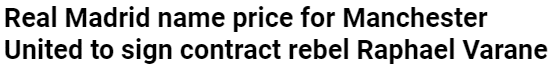 西班牙媒体《ABC》表示,瓦拉内与皇马的合同将于明年6月到期。目前,瓦拉内还未与皇马达成续约方面的一致。今年夏天若出售球员,皇马将为瓦拉内标出6000万欧元(5100万英镑)至7000万欧元(5900万英镑)的要价。