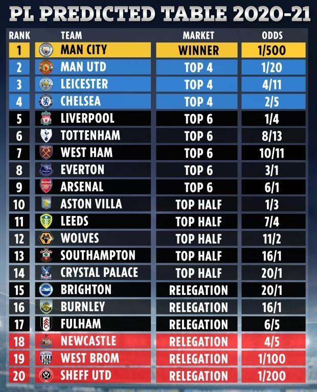 如图,上图是英格兰媒体给出的各大球队的排名赔率和球队最终的排名。其中,曼城被认为最终排名榜首,毕竟这是没啥意外的事情。而曼联、莱斯特城和切尔西分别排名第二、第三和第四,他们被认为是本赛季英超前四。而利物浦会最终排名第五,热刺会最终排名第六。他们会获得欧联杯的资格。而其他争四球队西汉姆会最终排名第七,埃弗顿第八,阿森纳第九,维拉排名第十。