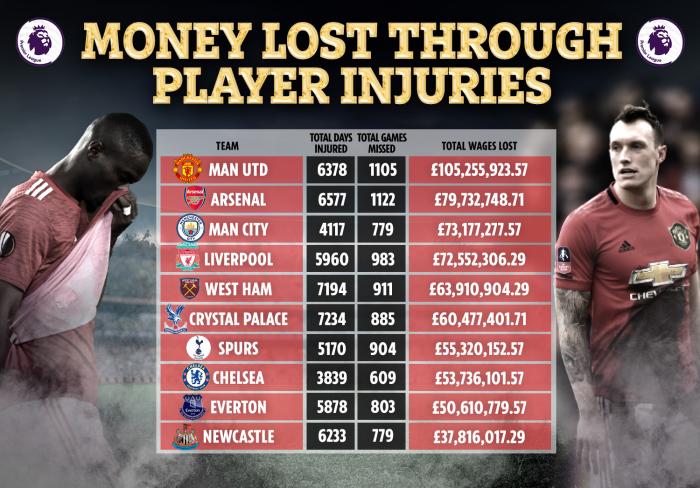 利物浦以7250万镑的总花费排名第四,其中荷兰铁卫范迪克和英格兰国脚张伯伦都因严重的伤病而远离赛场。西汉姆、水晶宫、热刺、切尔西、埃弗顿和纽卡斯尔,也跻身因球员受伤损失排行榜前10位,但他们中许多球队的财政损耗只有曼联的一半。