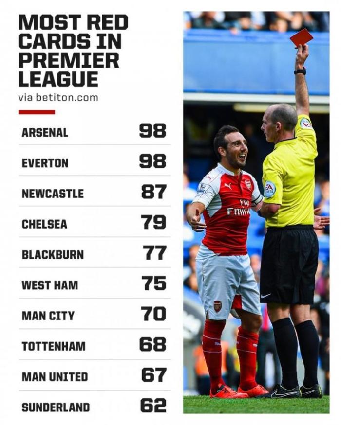 直播车讯北京时间3月27日,外媒统计英超历史红牌榜TOP10,阿森纳和埃弗顿98次染红并列第一,英超BIG6中除利物浦外全部上榜。