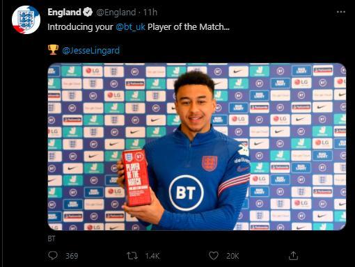直播车讯北京时间3月26日,英格兰队官方宣布,林加德当选与圣马力诺一战全场最佳球员。