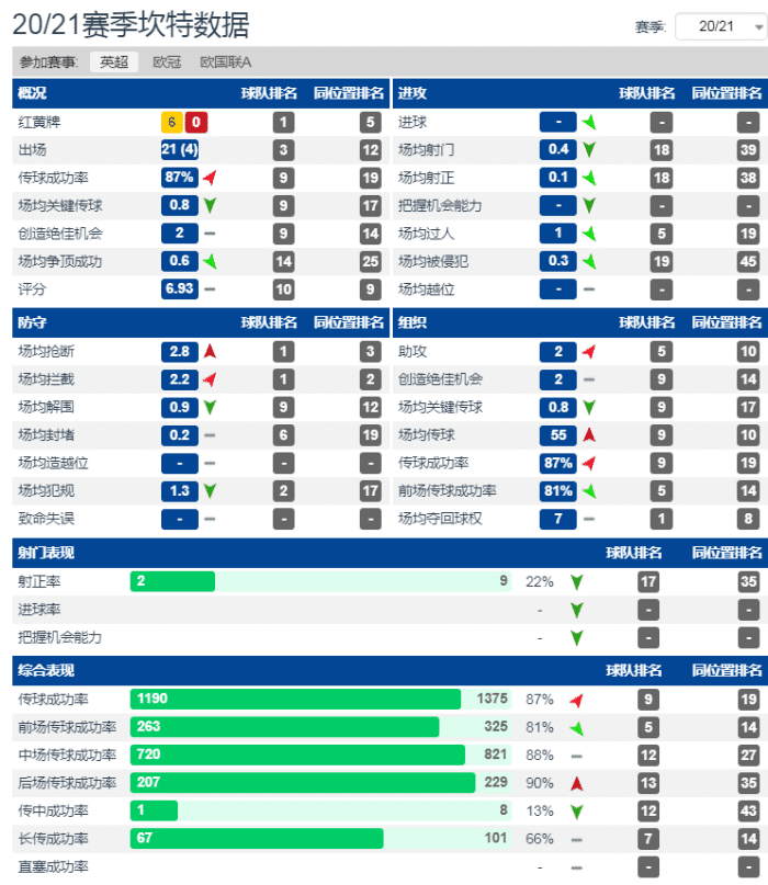 而坎特和罗德里相比,他的防守更好,但是组织方面差了很多。本赛季坎特场均抢断2.8次,场均拦截2.2次,场均解围0.9次,场均封堵0.2次,场均夺回球权7次,场均争顶成功0.6次。不过,坎特的传球成功率只有87%,这个数据是远不如罗德里的。从数据来看,坎特的抢断和拦截能力更强一些,但是他的传球数据比罗德里还是有差距的,特别是长传球方面,他的长传转移比起罗德里差了至少一个档次。