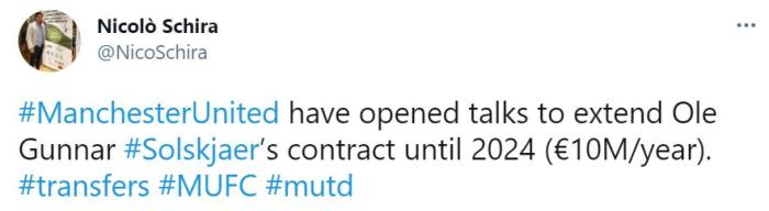 索尔斯克亚与曼联的合同将在明年夏天到期,俱乐部现在已经与他展开续约谈判,曼联打算将索尔斯克亚的年薪涨至1000万欧元,并与他续约到2024年夏天。