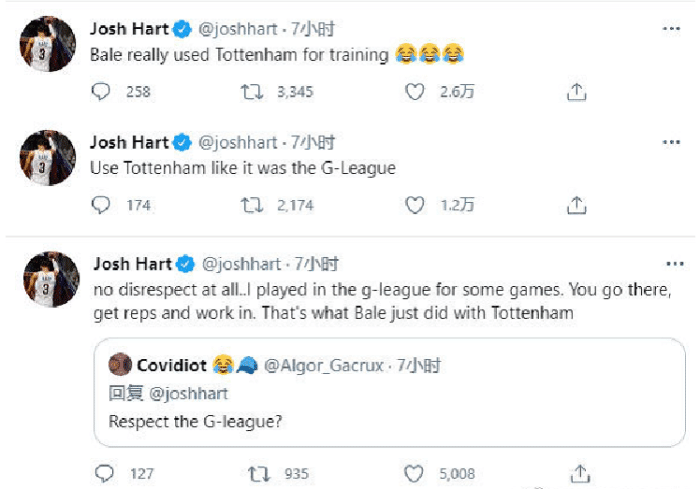 近期,切尔西球迷,目前在NBA打球的约什-哈特在社交媒体上连发三条推特嘲讽贝尔: