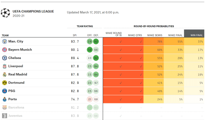 来源:直播车03-18 20:23直播车3月18日讯 随着欧冠八分之一决赛全部的结束,欧冠八强球队也全部出炉了,曼城、拜仁、切尔西、利物浦、皇马、多特、巴黎和波尔图八支球队晋级本赛季欧冠八强。而这八支球队进入八强之后,所有媒体也都开始猜测,到底谁能拿到本赛季欧冠冠军呢?而近日,欧洲权威数据媒体网站“538”利用大数据预测了本赛季欧冠夺冠的几率,其中曼城是独一档的存在,他们是最被看好的球队,而上赛季欧冠冠军拜仁的夺冠几率甚至不及曼城的一半。
