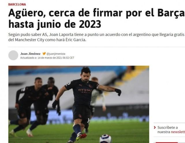 来源:直播车03-14 20:50直播车讯 北京时间3月14日,来自西班牙知名媒体《阿斯报》驻巴塞罗那记者Juan Jimenez的消息,效力于曼城的前锋阿奎罗,已经与巴萨新任主席拉波尔塔达成了协议,他将会在今夏自由身加盟巴萨俱乐部。据悉,阿根廷射手将会与巴萨签约2年,合同至2023年。
