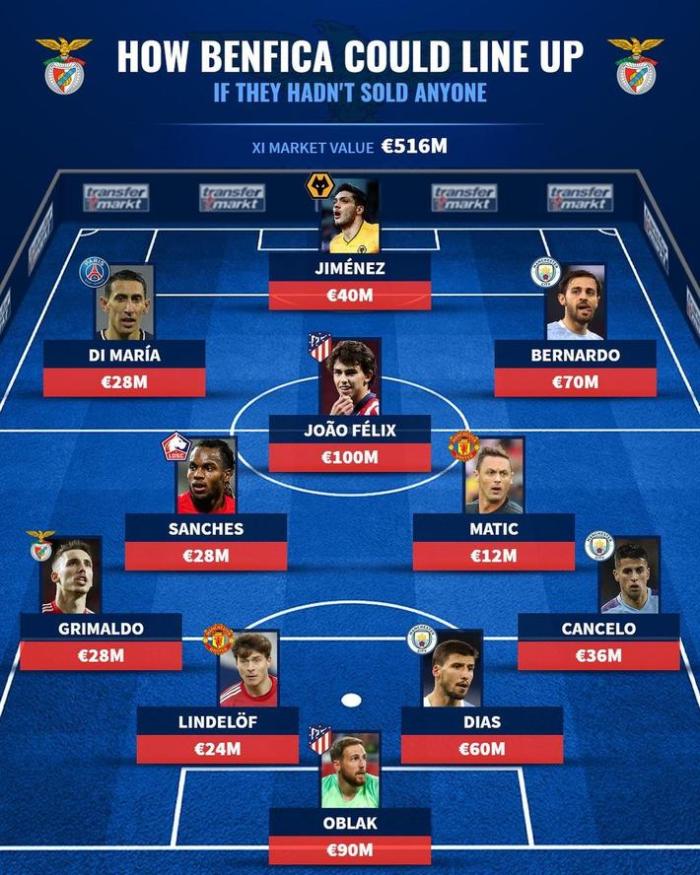 直播车3月14日讯 转会市场网本周列出了效力过本菲卡的现役球员最佳阵,奥布拉克、菲利克斯、贝尔纳多-席尔瓦等人入选,11名球员当前的总身价高达5.16亿欧元。
