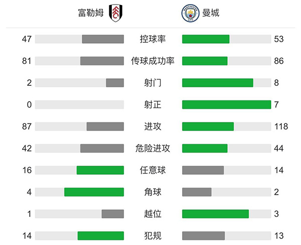 曼城3-0富勒姆 阿圭罗点射破荒热苏斯建功