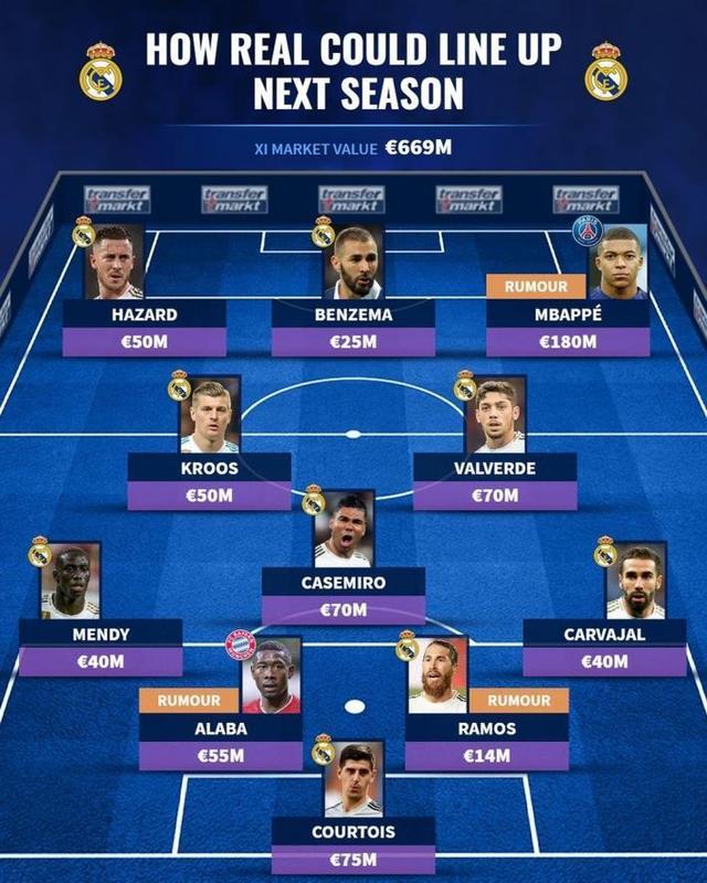 德转预测皇马下赛季首发阵容(总身价6.69亿欧):