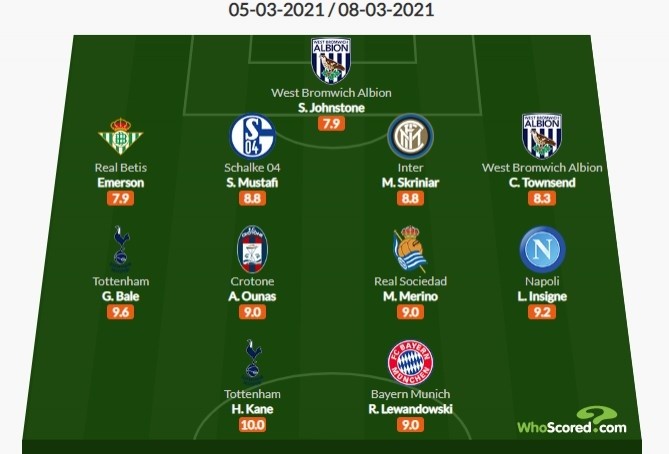 直播车讯 北京时间3月9日讯欧洲五大联赛结束了新一轮的争夺,著名数据网站《Whoscored》也评选出了周最佳阵,凯恩、莱万领衔,贝尔、穆斯塔菲在列。