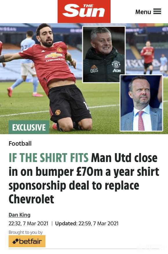 2014年夏天,曼联官宣雪佛兰成为球队的球衣赞助商,年赞助费是6400万英镑。这个消息传出之后,许多曼联球迷都感到兴奋,因为球队有钱了。不过,随后曼联球迷不开心了,因为这个标志在球衣胸口显得不是那么和谐。不过,现在曼联终于要更换球衣赞助商了,曼联和雪佛兰的合同在今年12月份到期,而目前双方续约的意愿都不大,这种情况下曼联已经开始寻找新的球衣赞助商了。