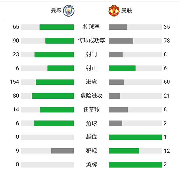 全场比赛结束,曼城0-2不敌曼联,结束了各项赛事连续的21场连胜。