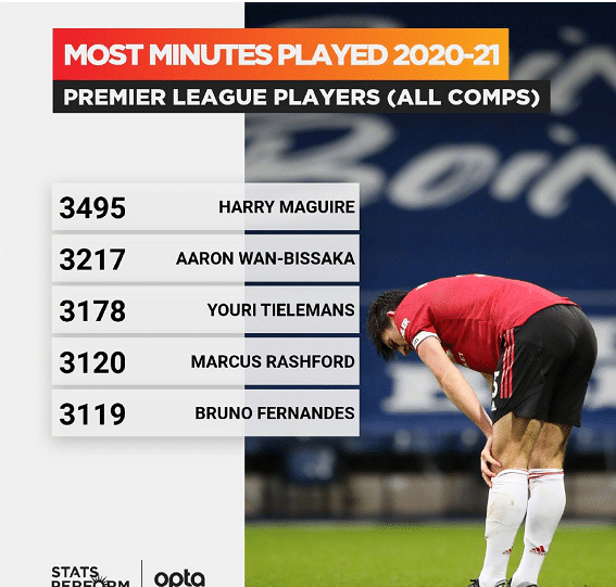 而排名第二的是曼联的边后卫比萨卡,他本赛季各项赛事出场了3217分钟,他因为在12月份受伤,比马奎尔少踢了两场比赛,其他比赛比萨卡基本上都参与了。而第三的是莱斯特城中场蒂莱斯曼,他本赛季各项赛事出场3178分钟,而且当初他曾经和曼联传出过绯闻哦,如果当初加盟曼联的话,那么前五都是曼联的球员了。第四是曼联的拉什福德,他本赛季代表曼联出场3120分钟,本赛季拉什福德本赛季代表曼联出场了42次,参与了球队所有的比赛。而第五的是曼联的B费,他本赛季出场3119分钟,B费本赛季首发替补一共出场40次,只缺席了两场比赛。