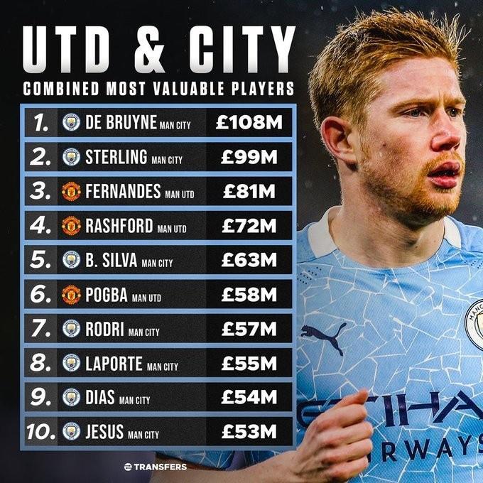 来源:直播车03-07 19:05直播车3月7日讯北京时间3月8日凌晨,英超第27轮迎来曼市德比。推特主“Football Transfers”盘点了双方阵中身价最高的10位球员,其中曼城7人入选,曼联3将上榜。德布劳内身价1.08亿镑居首,斯特林9900万镑次席,B费8100万镑排第三。