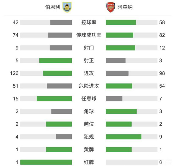 全场比赛结束,阿森纳1比1战平伯恩利。