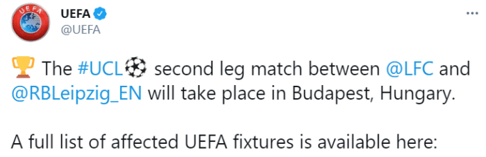 欧足联官方表示,利物浦与莱比锡的次回合比赛,还将在位于匈牙利布达佩斯的普斯卡什球场进行。