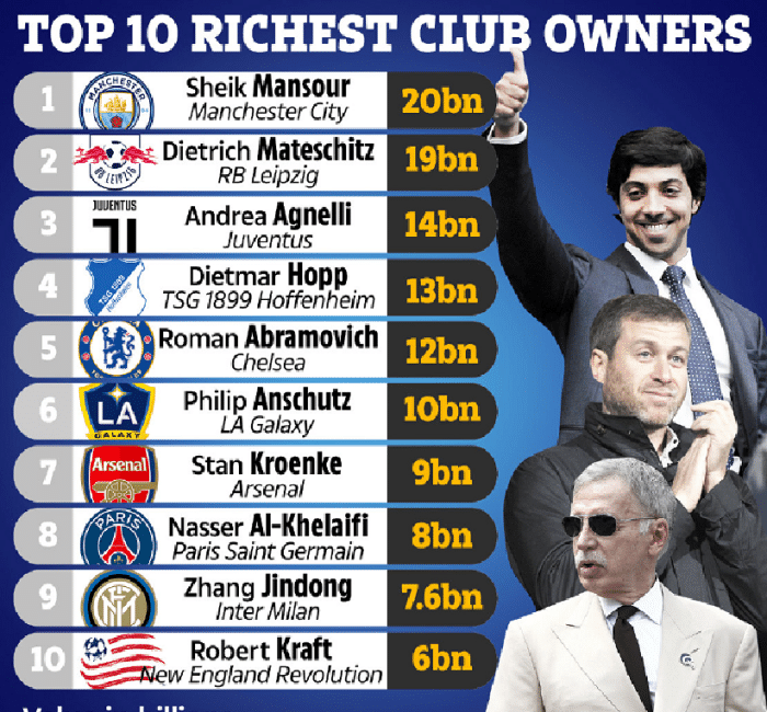 足坛俱乐部老板资产排行:曼城老板榜首,莱比锡老板第二!