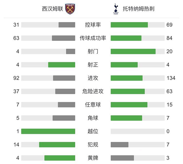 全场比赛结束,西汉姆2-1热刺。