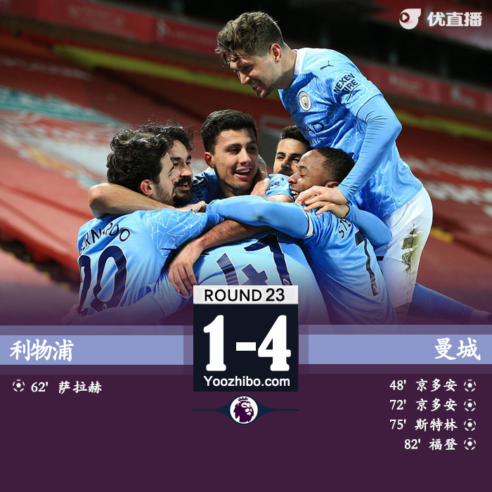 全场比赛结束,曼城客场4-1战胜利物浦。