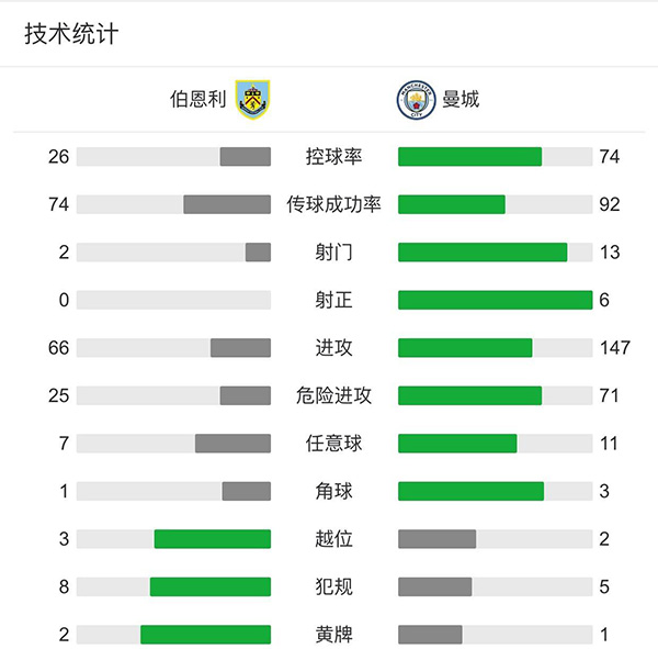 全场比赛结束,曼城2-0客胜伯恩利,各项赛事13连胜。