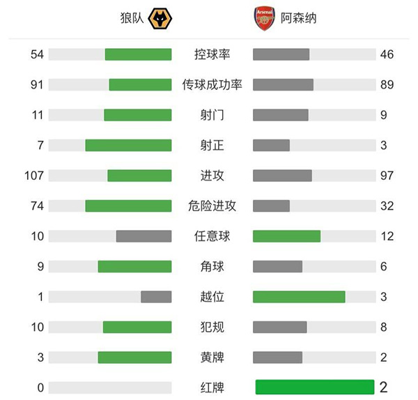 阿森纳1-2狼队 佩佩破门难救主路易斯莱诺染红