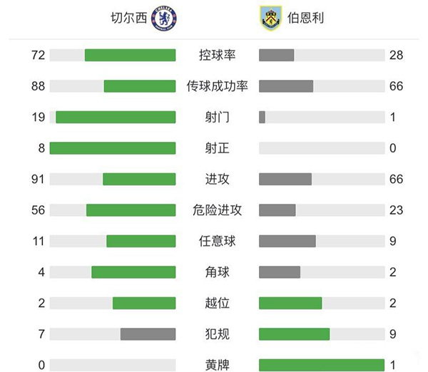 最终全场比赛结束,切尔西主场2-0战胜伯恩利。