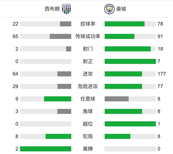 下半场比赛补时2分钟,全场比赛结束,曼城客场5-0大胜西布朗,联赛迎来7连胜登顶英超积分榜。