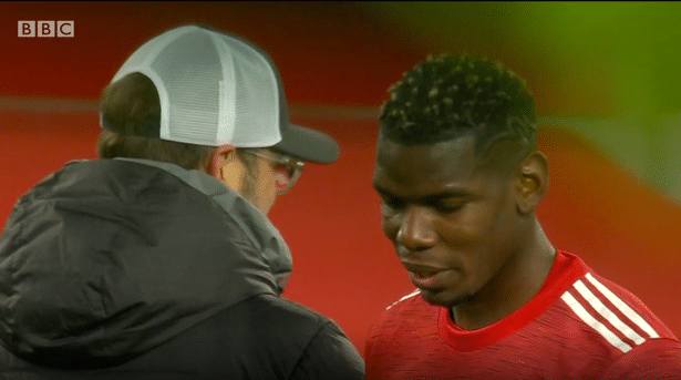 电视直播画面显示,输球后,克洛普仍然有风度地与博格巴及其他曼联球员握手致意。但不久之后,博格巴主动喊住了克洛普,渣叔转过身来,与法国巨星进行了较长时间的交谈。