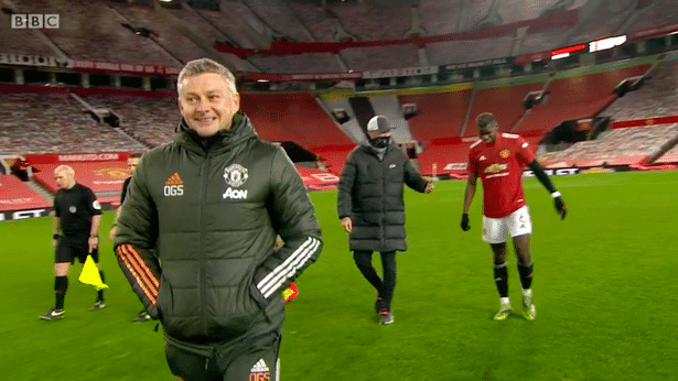 两人在中圈附近相视而笑,然后一起边走边聊,走向老特拉福德的球员通道。有趣的是,索帅此时就走在两人前面。
