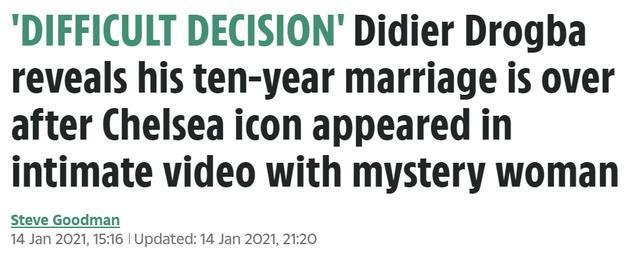 直播车1月15日讯 切尔西传奇球星德罗巴最近宣布他已经结束了自己20多年的婚姻,《太阳报》表示这位科特迪瓦前锋离婚是因为他出轨了。