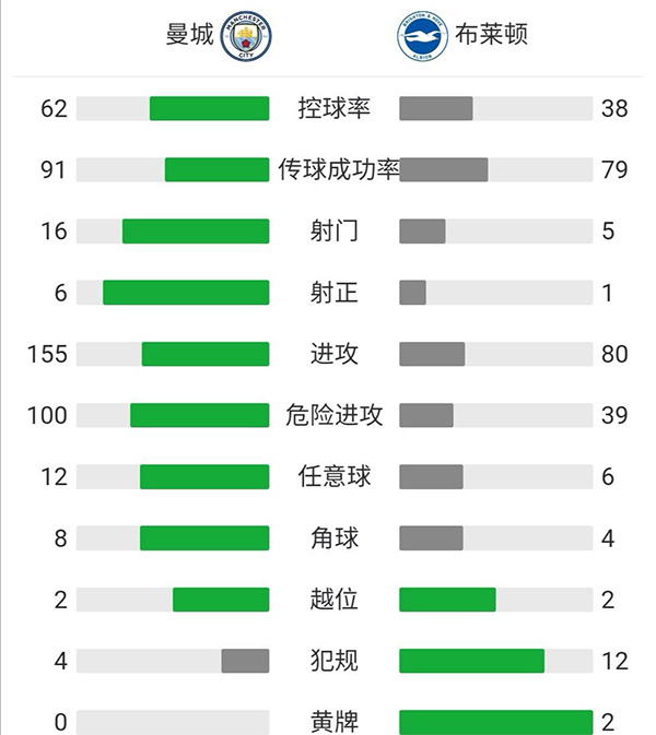 来源:直播车01-14 17:24 直播车讯:北京时间1月14日02:00,英超第18轮继续进行,曼城坐镇主场迎战布莱顿。上半场,德布劳内两脚中目标攻门均被罗伯特-桑切斯化解后,在半场结束前助攻福登内切低射制胜。下半场,德布劳内造点,斯特林操刀打飞,B席巧妙穿裆过人后爆射中楣。最终,曼城主场1-0击败布莱顿,取得联赛四连胜,各项赛事七连胜。
