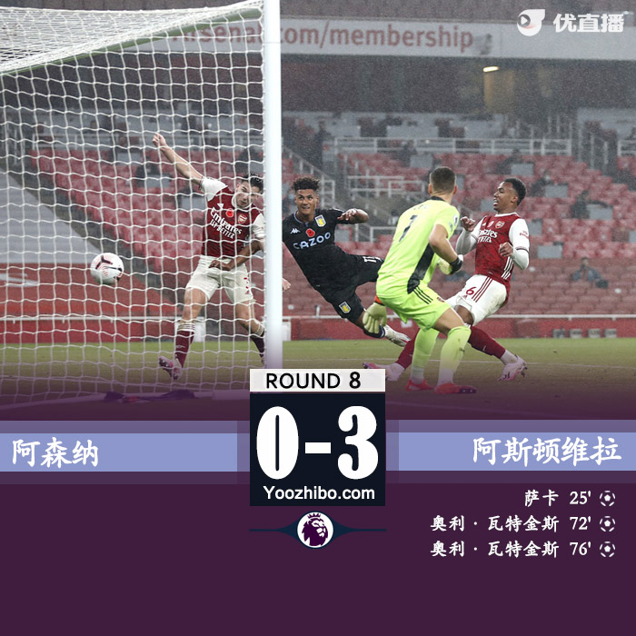 北京时间11月9日3:15直播车讯,英超第8轮,阿森纳迎战阿斯顿维拉。上半时萨卡乌龙送礼。下半时沃特金斯斩双响。最终,阿森纳0-3阿斯顿维拉。本场战罢,维拉15分,阿森纳12分。