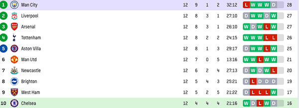 而本轮1-2被狼队逆转遭遇2连败的热刺,12轮后积分为26分,4队之间只有2分只差。当然,我们不能忽略他们身后的搅局者阿斯顿维拉。本轮埃梅里的球队3-1力挫富勒姆,悄然间12轮已经拿到了25分,只差曼城3分。前5名之间只有3分分差,这或许是近些年竞争最激烈的1次英超。